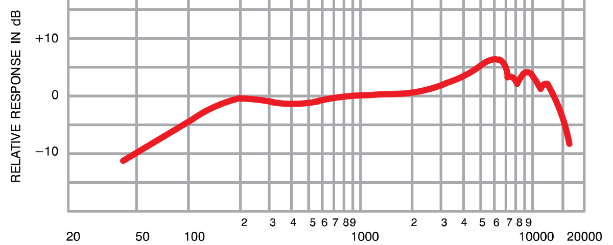 Note that is is anything but flat. In fact, it is not very sensitive in low nor high frequencies. And it shows an obvious bump up between 3000 and 10000 Hz. This may seem to be a bad mic, yet did I just mention it’s one of the most popular mics around? There is an advantage to the fact that each mic has a different frequency response. By doing so, they are effectively filtering the sound being captured and applying their own qualities and characteristics to the recorded sounds.